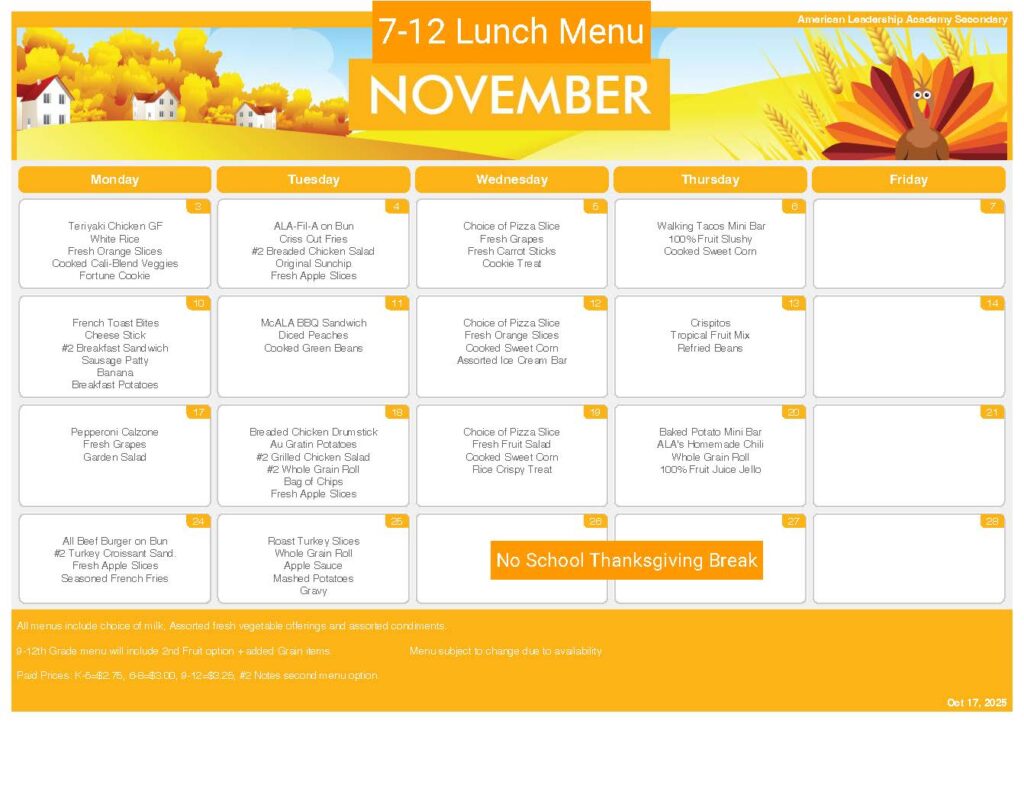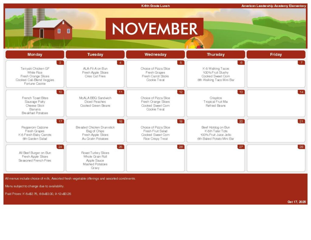 American Leadership Academy is part of the National School Lunch program. ALA works hard to provide not only healthy nutritious meals, but delicious meals
