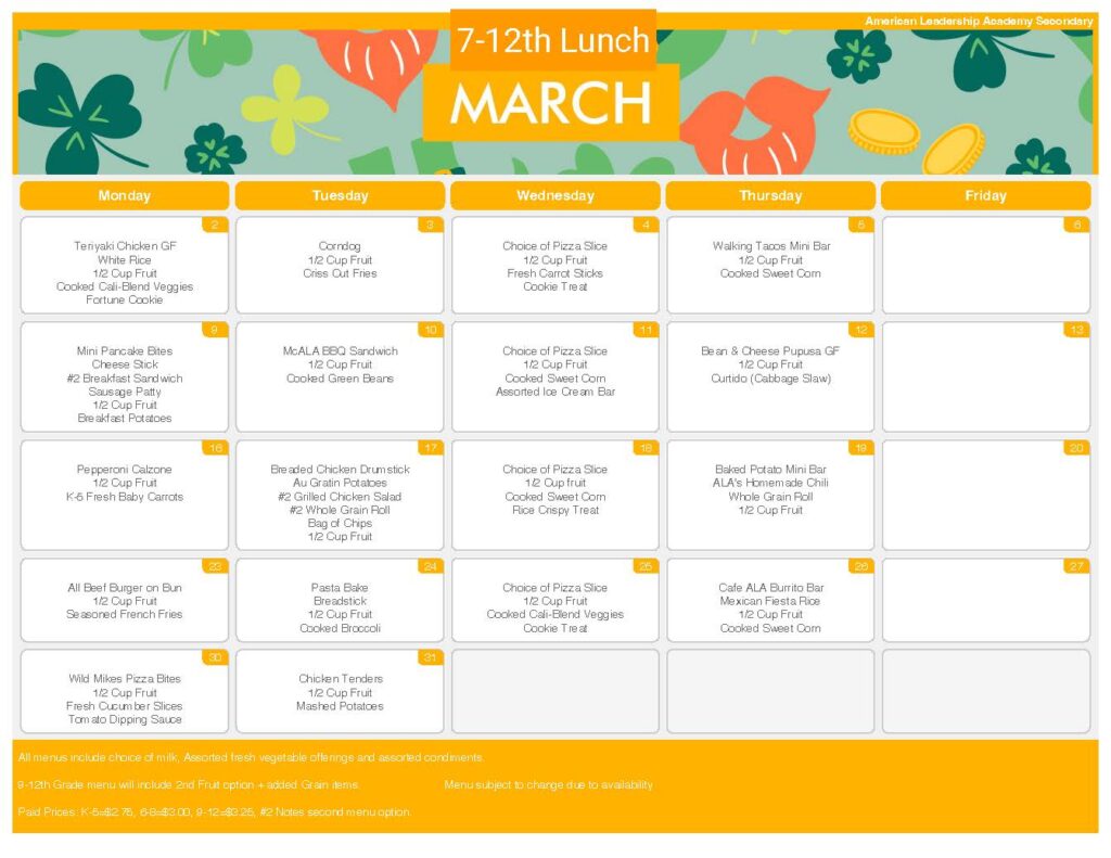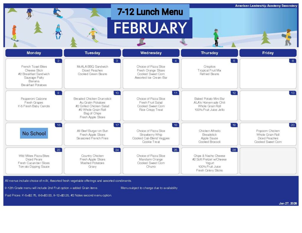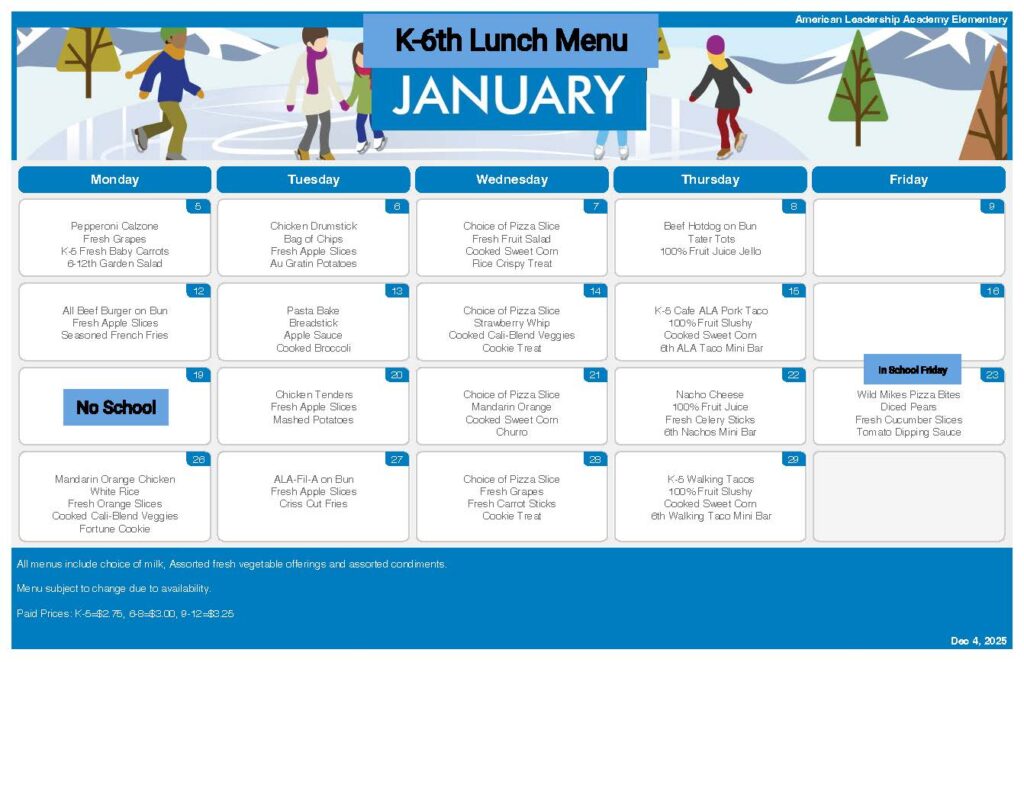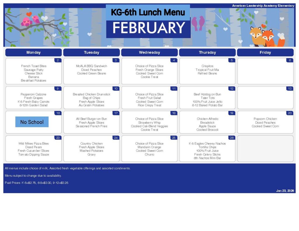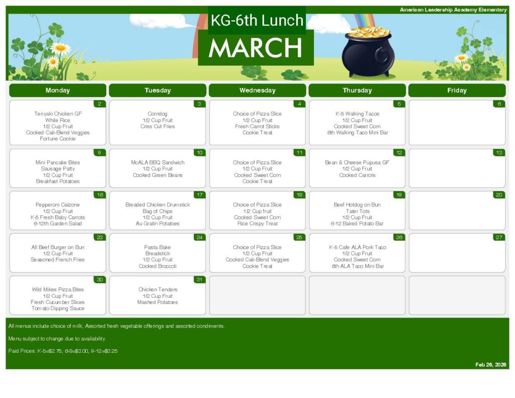 American Leadership Academy is part of the National School Lunch program. ALA works hard to provide not only healthy nutritious meals, but delicious meals