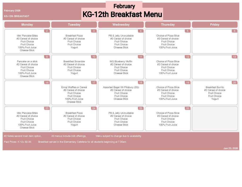 Breakfast and Lunch money can be paid online or be paid to the JH Front Office
